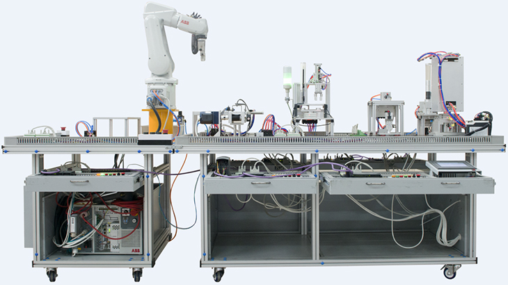 工業機器人循環生產線實訓裝備采用1+1組合式結構分別由安裝在鋁合金導軌式的實訓臺上的送料單元、加工單元、裝配單元、雙層輸送單元、分揀單元5個單元,加上由鋁合金導軌式的實訓臺上工業機器人碼垛單元兩大部分組合成多種組合方式的實訓裝備。電氣布局采用抽屜式,所有其電氣控制器都安裝在網孔板式的抽屜上,這種機電分離的格式更加符合了工業實際情況。外觀如上圖所示。