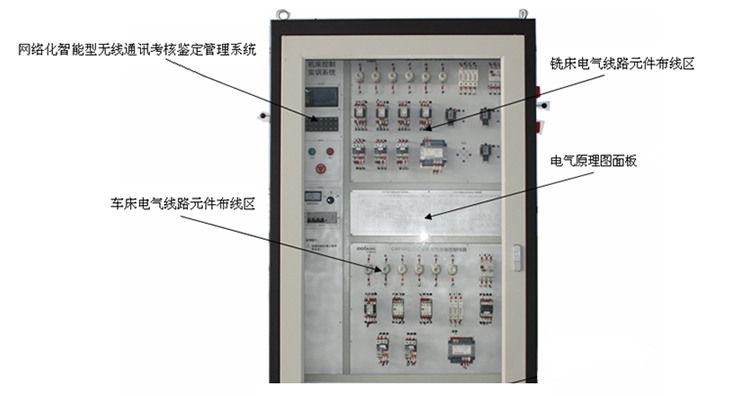 技能實訓(xùn)考核柜 四個機床操作按鈕及機床指示區(qū)面板 四個機床電氣線路元器件布線區(qū) 兩個機床轉(zhuǎn)接模塊區(qū) 網(wǎng)絡(luò)化智能型機床實訓(xùn)考核鑒定管理系統(tǒng) |