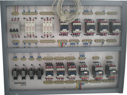 裝置實驗柜正面為車床和銑床的機床電氣線路元器件布線區(qū)面板。背面是鉆床和磨床的機床電氣線路元器件布線區(qū)面板。面板上裝有低壓斷路器、直插式保險絲、交流接觸器、熱繼電器、控制變壓器等元器件,這些元器件直接安裝在面板表面,可以很直觀的看它們的動作情況,且都有相應(yīng)的測試點,方便接線及故障考核檢測線路操作。
