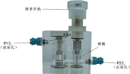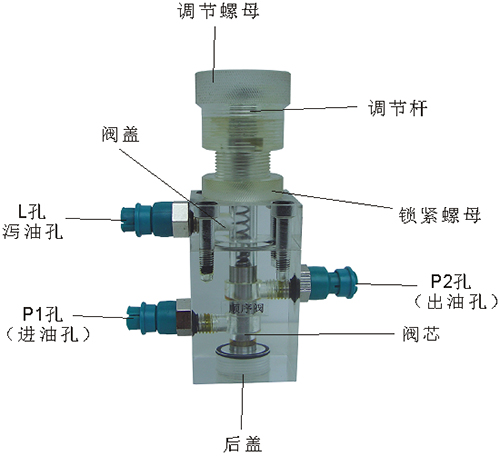 2、液控單向閥結構上參考了國產IY-25B型液壓單向閥,其閥體、螺塞等采用了進口透明有機玻璃材料精制而成,閥芯、頂桿采用了45#中碳鋼材料,并配合彈簧,油接頭,密封圈等標準件裝配而成,通過它可明確地觀察到活塞、彈簧、油孔等結構及其運行過程,具有形象逼真,性能可靠等優點。它即可作為教學模型,也可以作為液壓實驗元件進行實驗演示。