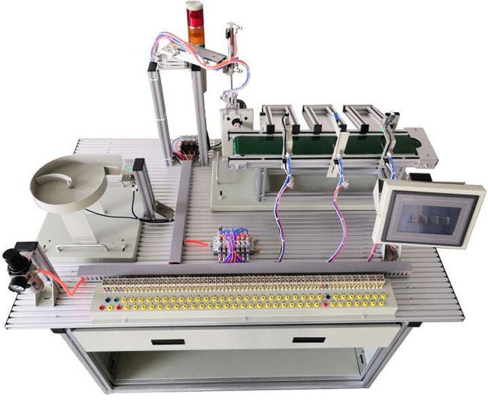 機電一體化實訓裝置臺架為鋁合金導軌式,實訓考核裝置PLC模塊的I/O 端子、變頻器的接線端子、各常用模塊與PLC的連接端子,均與安全插座連接,使用帶安全插頭的導線進行電路連接;各指令開關、光電開關、傳感器和指示元件的電路,則通過端子排進行連接。插拔線連接電路與端子牌連接電路相結合,既保證學生基本技能的訓練、形成和鞏固,又保證電路連接的快速、安全和可靠。