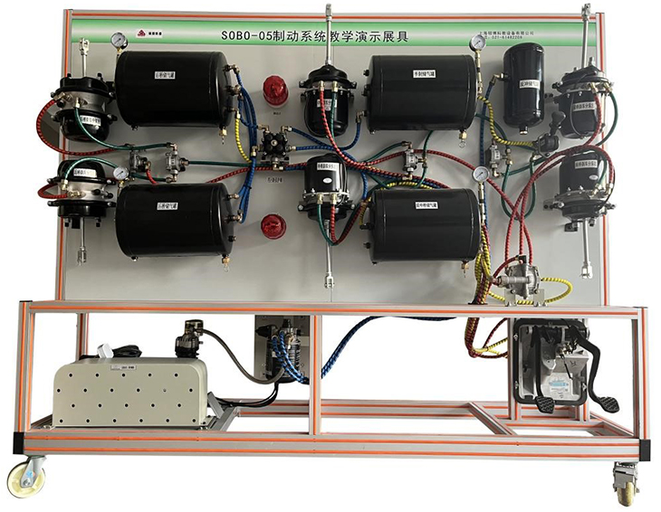 1.臺架上具有的全新東風(fēng)天錦原車零部件有空氣壓縮機(jī)總成、空氣干燥劑、前橋儲氣筒、后橋儲氣筒、手制動儲氣筒、再生儲氣筒、輔助儲氣筒、四回路保護(hù)閥、制動腳閥、駐車閥、繼動閥、制動管路、氣壓表若干個。