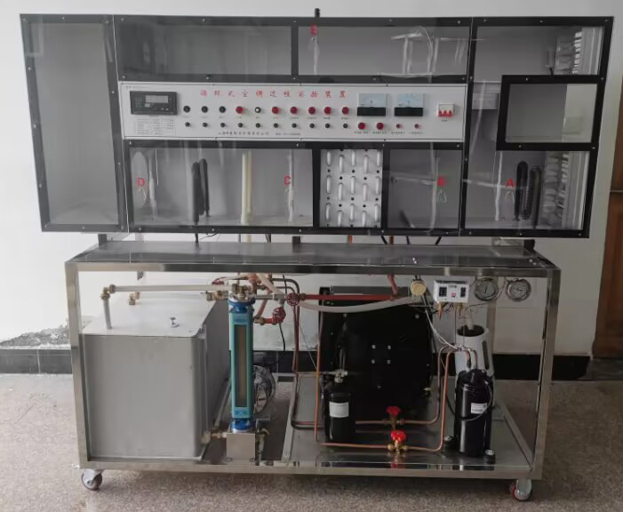 空氣熱濕處理實驗裝置為《空氣調(diào)節(jié)》課程實驗教學(xué)設(shè)備,用它可以模擬不同季節(jié)室內(nèi)和室外的環(huán)境和空氣處理調(diào)節(jié)的方法,進(jìn) 行集中式空調(diào)系統(tǒng)不同循環(huán)形式的空氣調(diào)節(jié)實驗。還可以 做變風(fēng)量運行調(diào)節(jié)實驗和制冷系統(tǒng)的參數(shù)測定及其調(diào)節(jié)實驗。裝置具有透明風(fēng)管,可直觀地觀察和測試。實驗裝置的 結(jié)構(gòu)由空氣循環(huán)系統(tǒng)、加濕器、加熱器、冷卻器及其冷水 機(jī)組和相應(yīng)的測試儀表等組成。可以實現(xiàn)對空氣的加熱、冷卻、加濕和除濕(表冷式和淋水式可互換使用)等處理。 在實驗中,還可以對空氣的溫度、濕度、流量進(jìn)行測量,并 能對加溫器、加熱器的輸入電功率進(jìn)行測定,從而可以計算各空氣處理過程中的熱量和濕量得失,以及進(jìn)行熱、濕平衡 的分析。