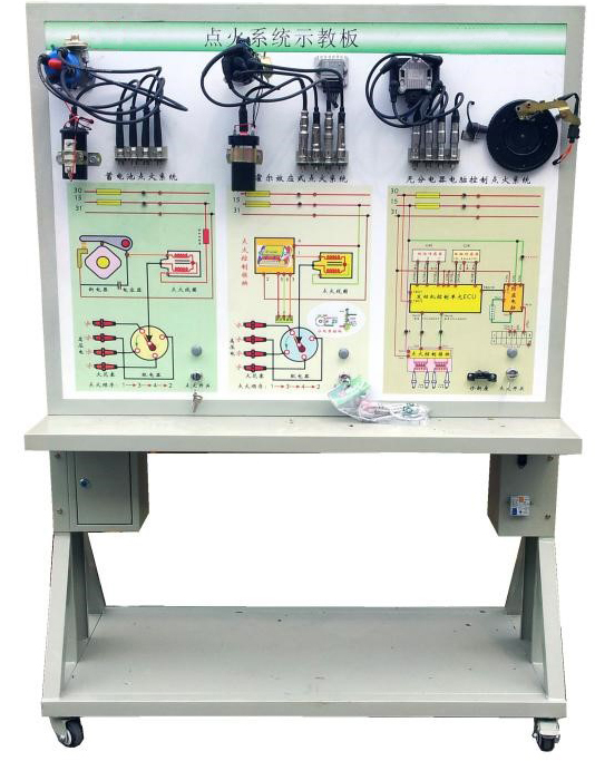 汽油發動機點火系統保養模塊教具架該設備采用全新 三種典型(即:觸點式點火系統、霍爾式電子點火系統、無分電器分組點火系統)的發動機點火系統的真實部件,充分展示發動機點火系統的組成結構和工作過程。