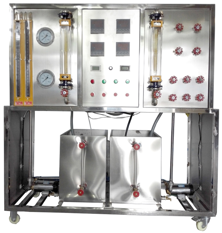 鋼原水箱及加熱水箱,順、逆流調節閥門組,阻力測試壓力表及U型差壓計,加熱功率由固體調壓模塊無級調節,萬能信號輸入巡檢儀顯示溫度,電流表,電壓表,不銹鋼臺架及控制屏等。