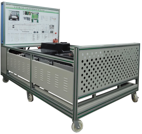 (比亞迪e5 EV300純電動汽車) 鋰動力電池組、電池管理系統(tǒng)BMS、BMS顯示屏(7寸觸摸屏)、維修開關(guān)、輔助蓄電池(12V45AH)、高壓配電箱、漏電傳感器、車載充電機、國標(biāo)充電插座與充電槍、直流接觸器(包含充電繼電器、總正繼電器、總負(fù)繼電器、預(yù)充繼電器)、急停開關(guān)與電源總開關(guān)、一體化全鋁合金型材搭建的移動臺架(1500×700×1700mm ,帶自鎖腳輪裝置,帶安裝檢測端子的原理面板1448×940mm)、故障考核系統(tǒng)、設(shè)備操作說明書。