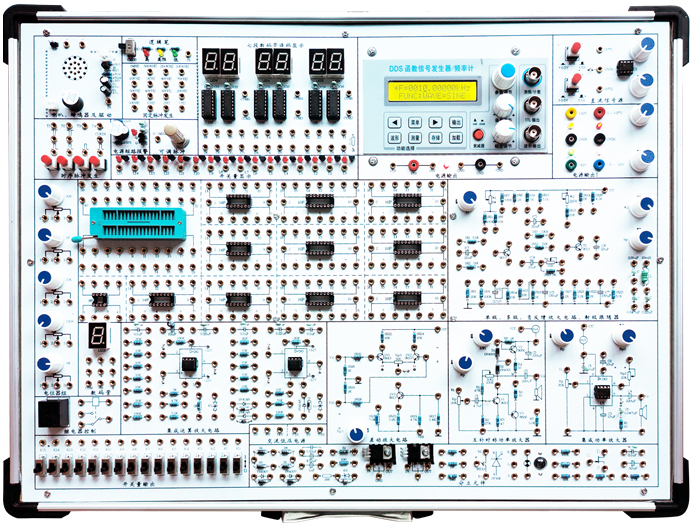 SD系列數字邏輯實驗儀主要由電源接口、通用電路單元、各式IC插座等組成。通用電路包括四位8421BCD碼LED顯示器,1位LED顯示器,時鐘電路,時序啟停電路,手動單脈沖電路,可調連續脈沖發生器,頻率計,十六位二進制電平顯示開關,十六位二進制電平輸入開關,邏輯筆、電位器組等。