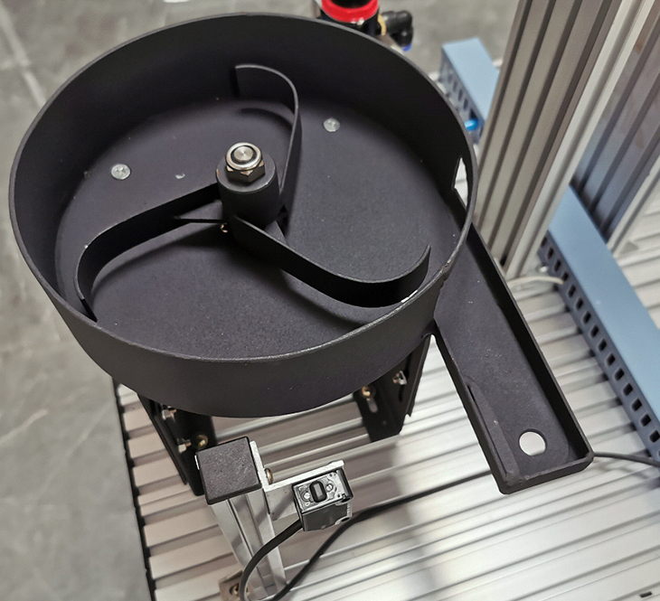 放料轉(zhuǎn)盤:轉(zhuǎn)盤中共放三種物料,一種金屬物料、一種黑色塑料物料、一種白色塑料物料。