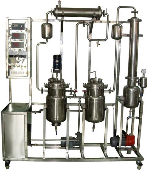 中藥提取實驗裝置由提取罐、蒸發器、攪拌電機、列管式加熱器、冷凝器、油分器、收油器、藥液泵、貯液罐、過濾器、真空泵、調速器、數顯溫度儀、不銹鋼框架、控制屏等組成。提取罐、蒸發器配導熱油加熱系統,提取罐、蒸發器頂部蒸汽出口均設置了除沫器。
