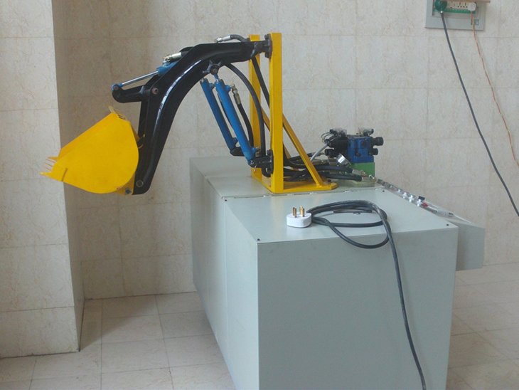 3、裝載機械按實物比例縮小的全金屬結構,實驗時啟動液壓系統根據實驗要求模以操作機械進行工作。