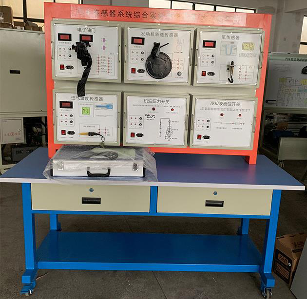 本實訓裝置采用全新原廠BOSCH ME7.5電噴系統中的傳感器,包括空氣流量傳感器、進氣溫度傳感器、發動機轉速傳感器、冷卻液溫度傳感器、氧傳感器、爆震傳感器、霍爾傳感器、增壓壓力傳感器、機油壓力開關、冷卻液液位開關和電子節氣門組件等汽車傳感器。系統部件均采用獨立的模塊化結構,更換方便,能根據需要擴展功能或開發新的實訓項目,并與電路圖符號相對應,需通過專用導線連接而構成汽車傳感器系統,訓練學生對傳感器的維修判斷能力。利用儀表可方便的在面板的連接插孔或檢測插孔上讀取檢測信號。